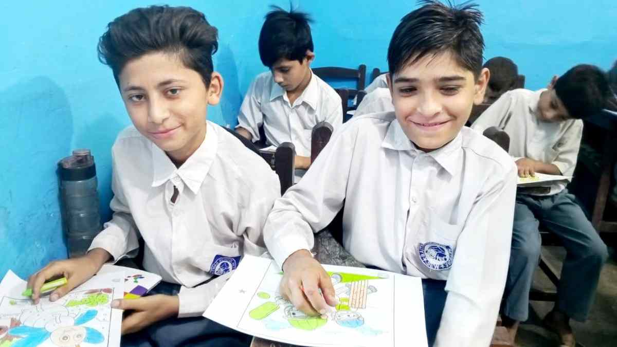 Smiling students from both schools gathered for a group photograph at Baithak School Qaid-e-Azam Colony under the CCDP 2025 initiative.